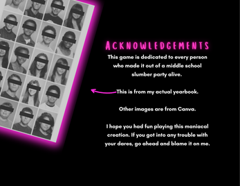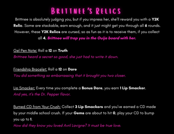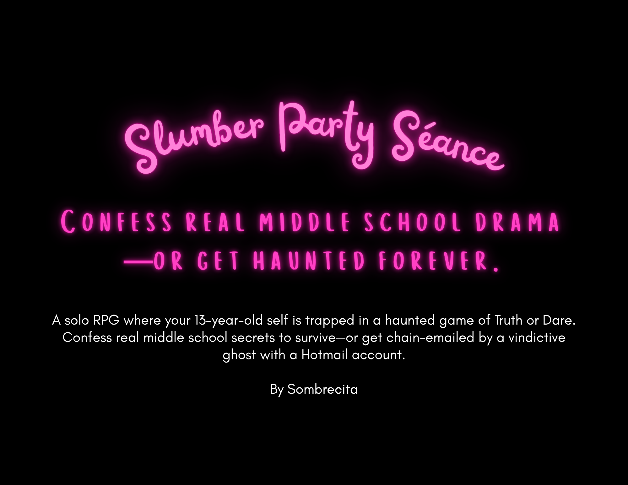 A solo RPG where your 13-year-old self is trapped in a haunted game of Truth or Dare. Confess real middle school secrets to survive—or get chain-emailed by a vindictive ghost with a Hotmail account.