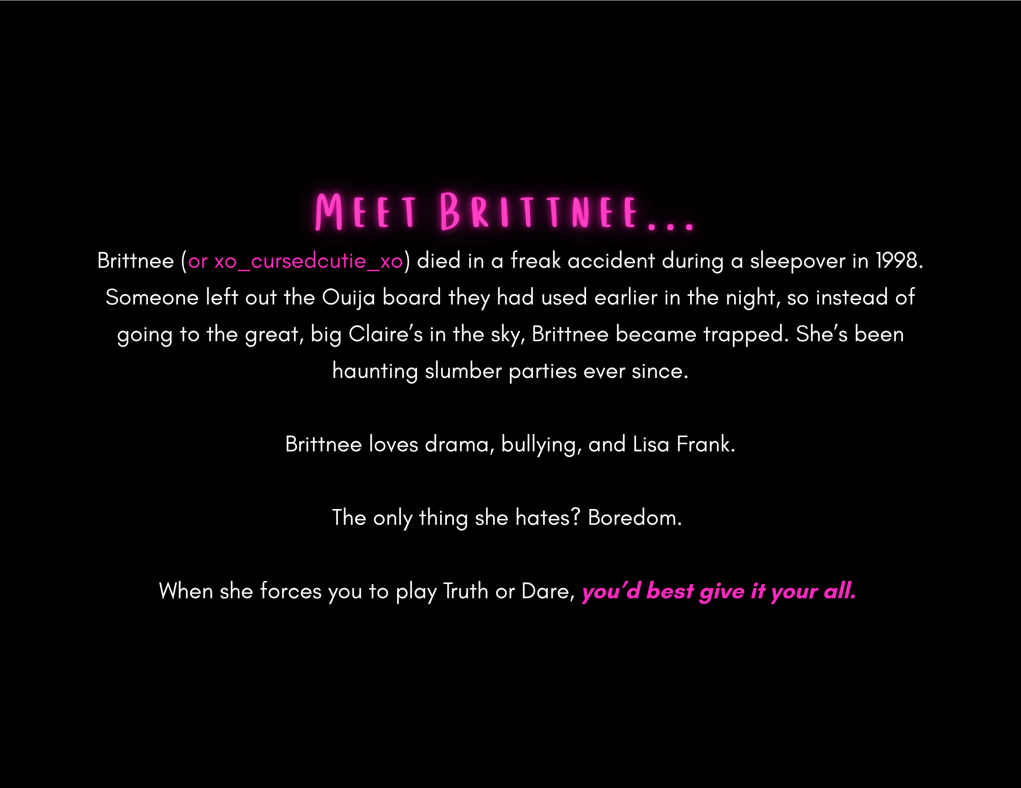 To survive the night, you’ll have to revisit real memories and confess secrets from when you were 13 years old. Make ‘em good, or she’ll become your worst nightmare.